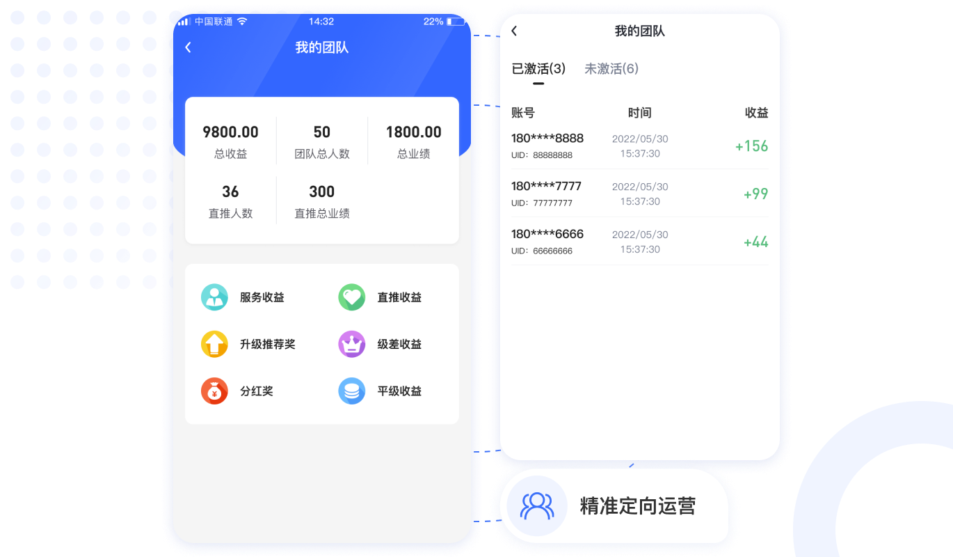 用戶激活收益,團隊推薦獎,團隊極差收益,快速裂變用戶